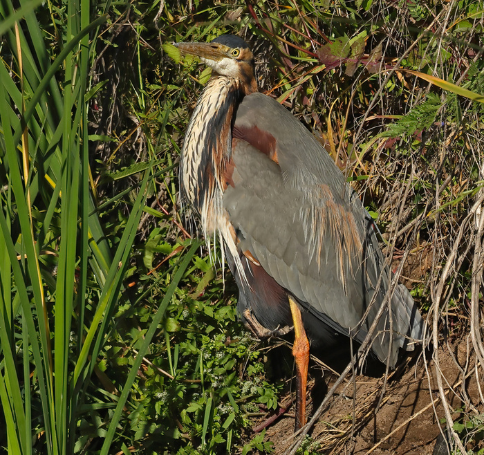 A secretive and very wary bird, the Purple Heron hides in undergrowth near water feeding unobtrusively. If caught out in the open they will fly away immediately if that is their best option, however, if they are found in a situation that they think compromises their safety by flying, their next course of action is to freeze and remain motionless relying on their natural camouflage.