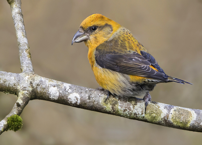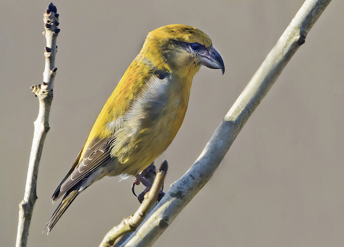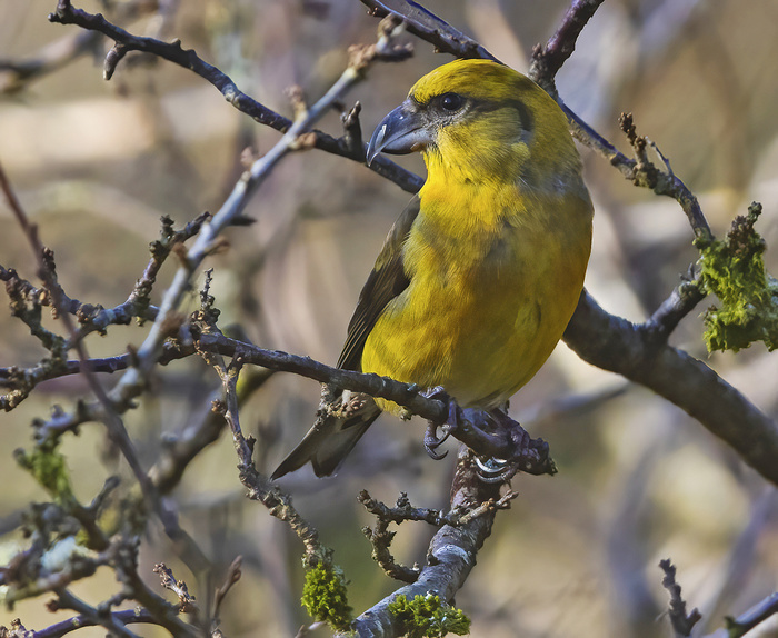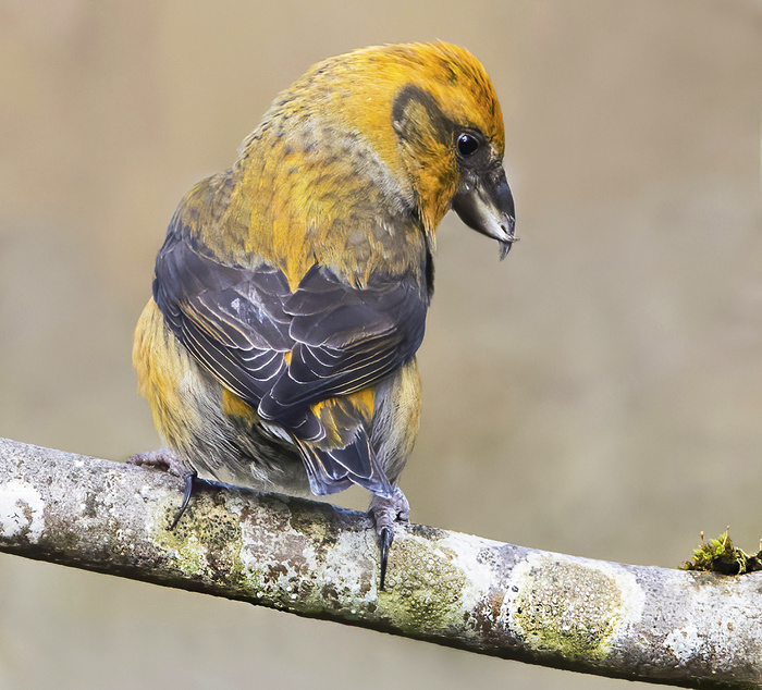 After a good walk around with only brief views we came back to the car had some coffee and just stood beneath the larches we had seen them in previously. Four or five birds appeared after ten minutes, but high up and silhouetted against the sky – no good for a photo. Then two birds started to drop down to lower branches and feed, still a bit high though, then one male bird dropped right down onto the top of a larch sampling about ten feet above the ground. I have seen this behaviour before but you have to react quickly, I took five steps forward and then shot him hand held. These birds are not inordinately shy but there’s a limit and he flew quickly back up high into the tree tops.