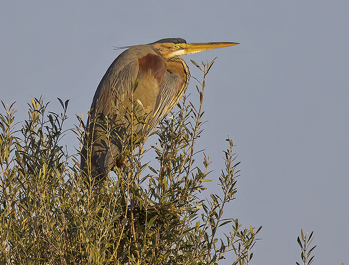 A bird we didn't expect to see perched in a tree was a Purple Heron, they are usually, for us anyway, skulking aroud a reed bed being quite elusive. One morning, however, we were out early to see what was on the local river before returning to to the hotel for breakfast. We rounded a corner and there was a Purple Heron sunbathing in the early morning sun, obviously warming up after a cold night in the reed beds.