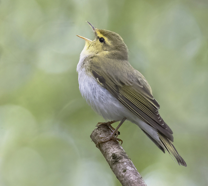I always like to try and get a shot of a Wood Warbler in the spring. They are one of my favourite little warblers. They live up to their name by breeding in the light mixed woodlands of the Brecon Beacons. They like an airy canopy and a bit of space between the trees to fly around and display. I love their spinning coin song and their multiple sharp little 'Peeps' when they call. This morning I was in such a woodland early and I was watching a bird calling and singing and displaying frequently. I positioned myself behing some foliage and watched and waited for an opportunity to try and get a shot. I was again using my Canon R5 with my Canon RF 100-500 f7.1 lens and a Canon speedlight 430EX mounted on the hot shoe for a bit of fill in flash. I couldn't have walked in these type of woods with my EF600 f4 and tripod, it's just too big and awkward. This little Canon RF 100-500 is so versatile for this type of shooting.