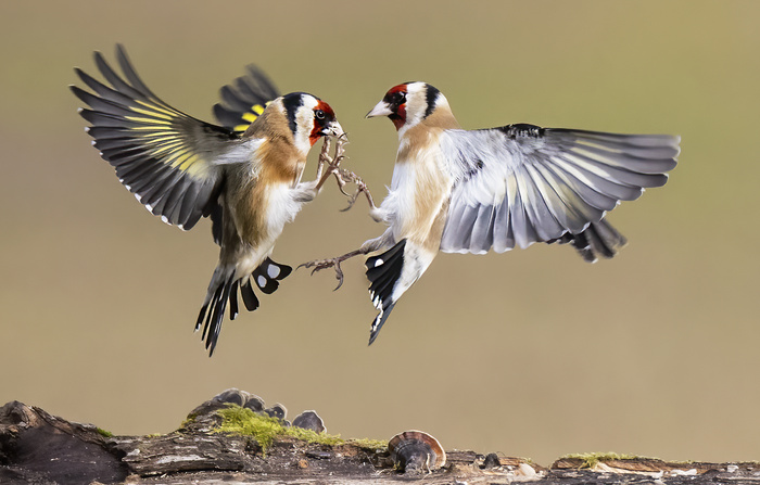 The next day I removed the previous perch that I had used for the images of the Goldfinches in mid-air (in the last blog post), and using a battery drill I fixed two new posts to two permanent fence posts and then cut the tops off with a chainsaw and made sure they were even using a spirit level – it’s important to do this. I cut two similar grooves in the perch as with the last perch because it seemed to work well and I fixed the new perch across the top of these posts using very long fencing nails because it was five inches deep and when I will want to change it, it’s much easier than trying to remove very long screws.