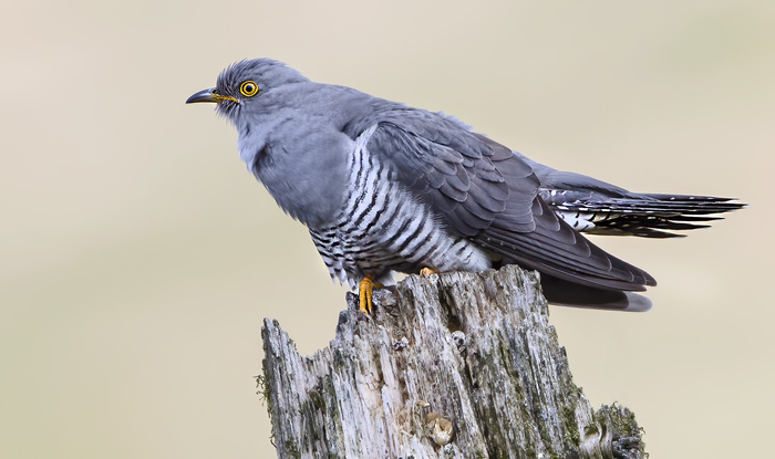 Between two particular conifer plantations in the Brecon Beacons there is an area of 'Clearfell'. (Nothing unusual in that I hear you say) but right in the middle of this clearfell there was one old rotten tree trunk about twenty feet high and it stood out like a sore thumb amongst the fallen branches. A number of times I witnessed Cuckoos flying from one plantation to the other and perching on this tree trunk to survey the area. I started to see an opportunity for an image in this situation, so a couple of years ago I manhandled a few of the fallen branches to form a kind of 'Teepee' which would act as a natural hide. This construction was about thirty feet from the tree trunk the Cuckoos were perching on. At first light one morning I positioned myself inside the Teepee and waited, for some time I must admit, for a Cuckoo to start calling. After much anticipation a male bird came in and landed right in front of me and this happened a number of times providing me with some quite decent images.