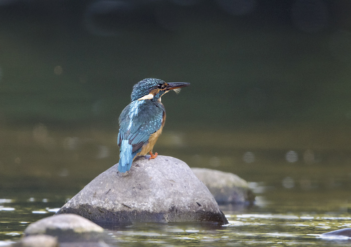 Kingfishers frequently fish off semi-submerged rocks in a river but also dive from heights of twenty five feet, contradicting how many people think they operate. They can spot a small fish from ten yards away using their polarizing vision- remarkable!