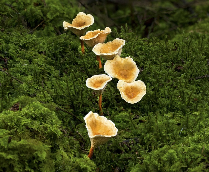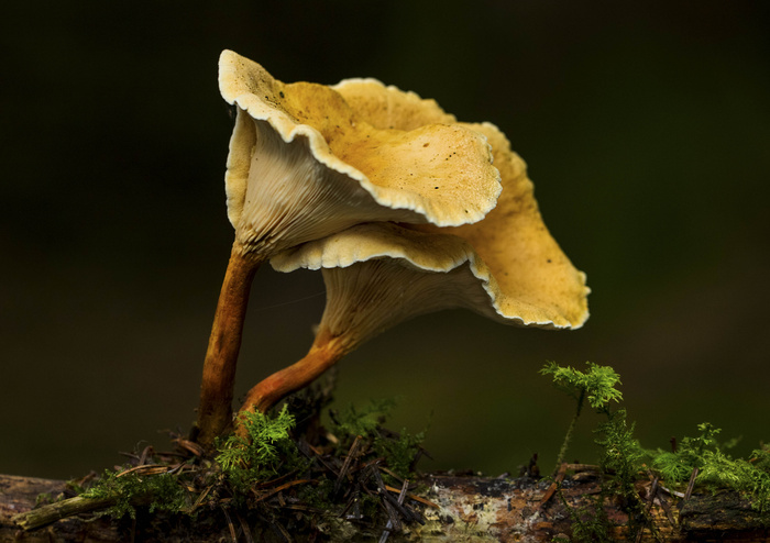 If these mushrooms had been true Chanterelles they would have been worth a fortune, but unfortunately true Chanterelles, a highly prized, delicious and very expensive mushroom, appear in mid to late summer and grow in primarily deciduous woodlands. These were in fact False Chanterelles and are not edible because they can give people bad gastric problems and some people have experienced hallucinatory episodes after consumption.