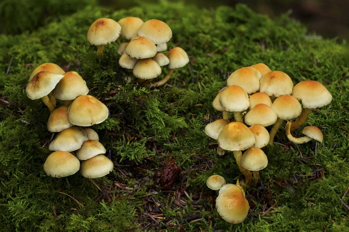 ‘Poisonous’ Sulphur Tuft mushrooms on rotting tree stumps.