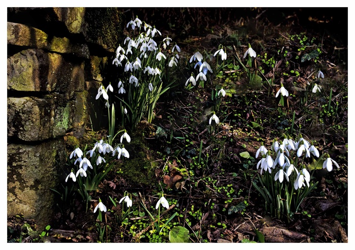 The sun's rays shone through the trees giving a dappling effect to the whole wood and I could see one little group of Snowdrops up against an old delapidated stone wall, long fallen into disrepair, but nevertheless augmenting the scene.