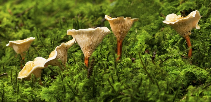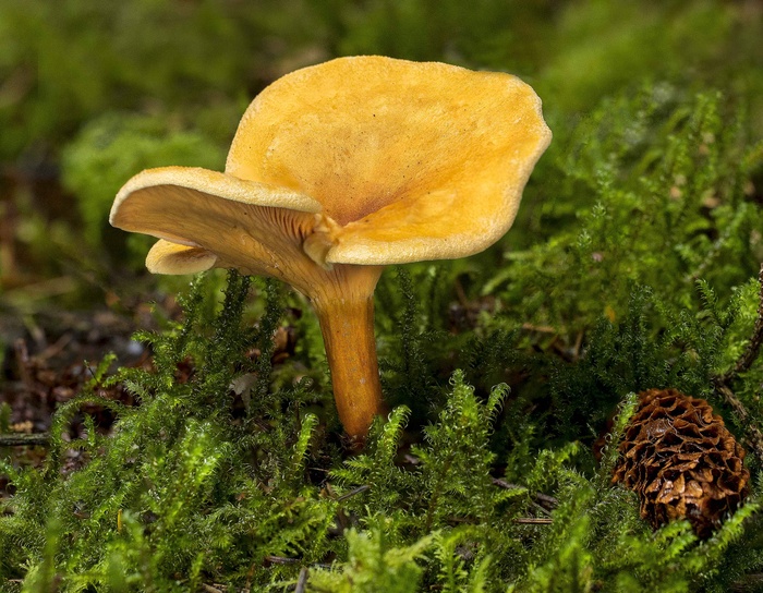 In order to save walking around with equipment unnecessarily, we always carry binoculars because this helps you to see across the woodland floor. However, nothing could have prepared us for the spectacle which appeared before us - hundreds of Chanterelle mushrooms in groups of up to fifty, and probably in total over a thousand throughout the woods.